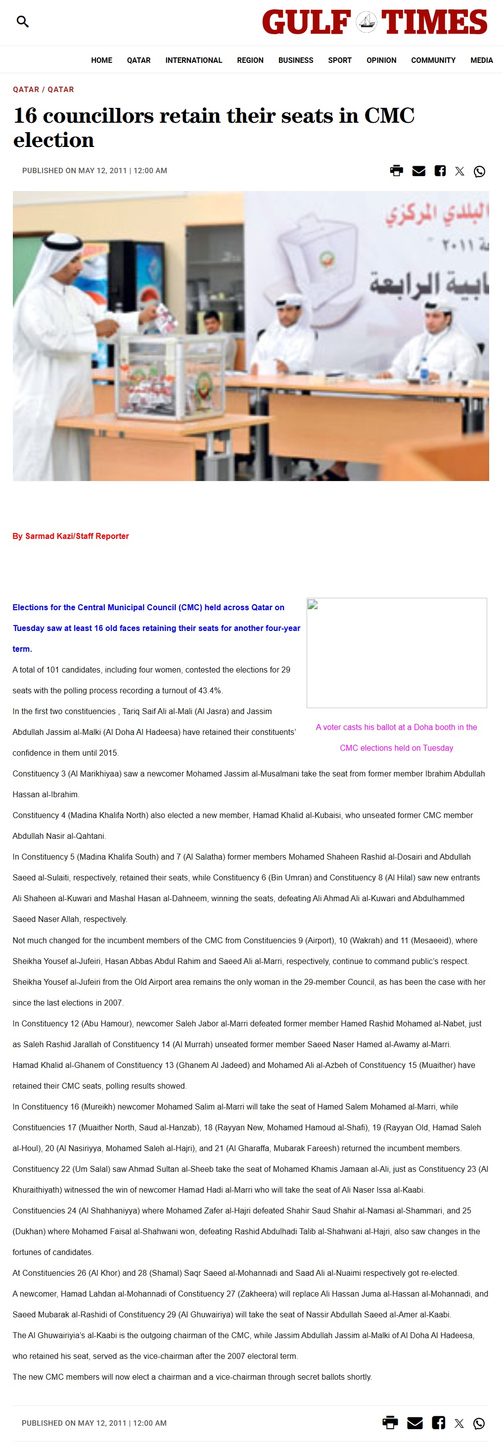 Elections for the Central Municipal Council (CMC) held across Qatar on Tuesday saw at least 16 old faces retaining their seats for another four-year term.