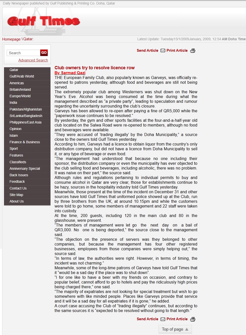 Meanwhile, those present at the time of the incident on December 31 and other sources have told Gulf Times that uniformed police showed up at the Club, run by three brothers from the UK, at around 10.15pm and while the customers were told to go home, some members of management and 22 staff were taken into custody.