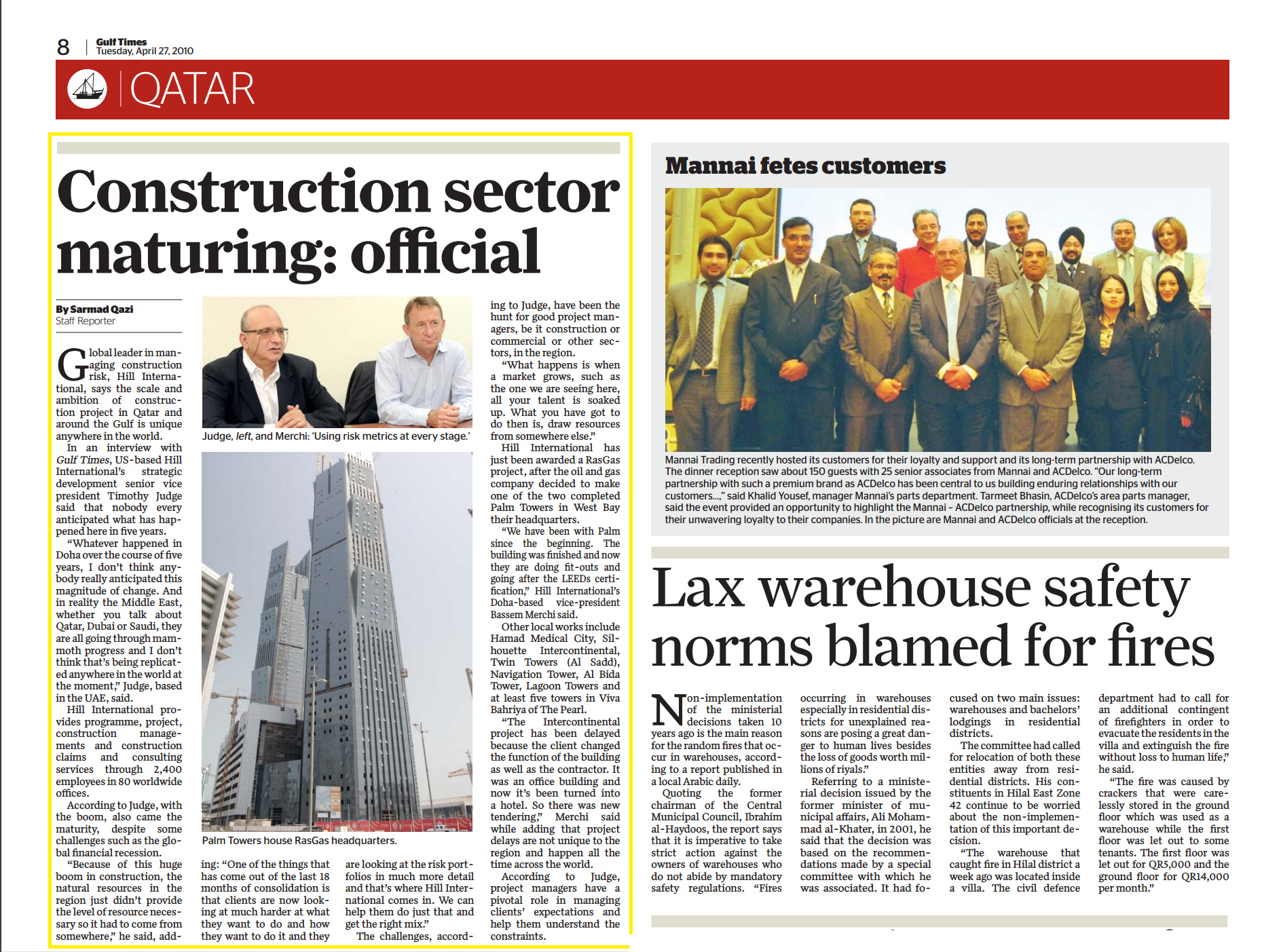 “What happens is when a market grows, such as the one we are seeing here, all your talent is soaked up. What you have got to do then is, draw resources from somewhere else.” Hill International has just been awarded a RasGas project, after the oil and gas company decided to make one of the two completed Palm Towers in West Bay their headquarters.
