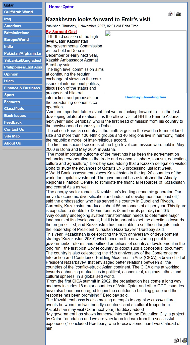 “The most important outcome of the meetings has been the agreement on enhancing co-operation in the trade and economic sphere, tourism, education, culture and agriculture,” Berdibay said adding that a Kazakh delegation visited Doha to study the advances of Qatar’s LNG processing just last week.