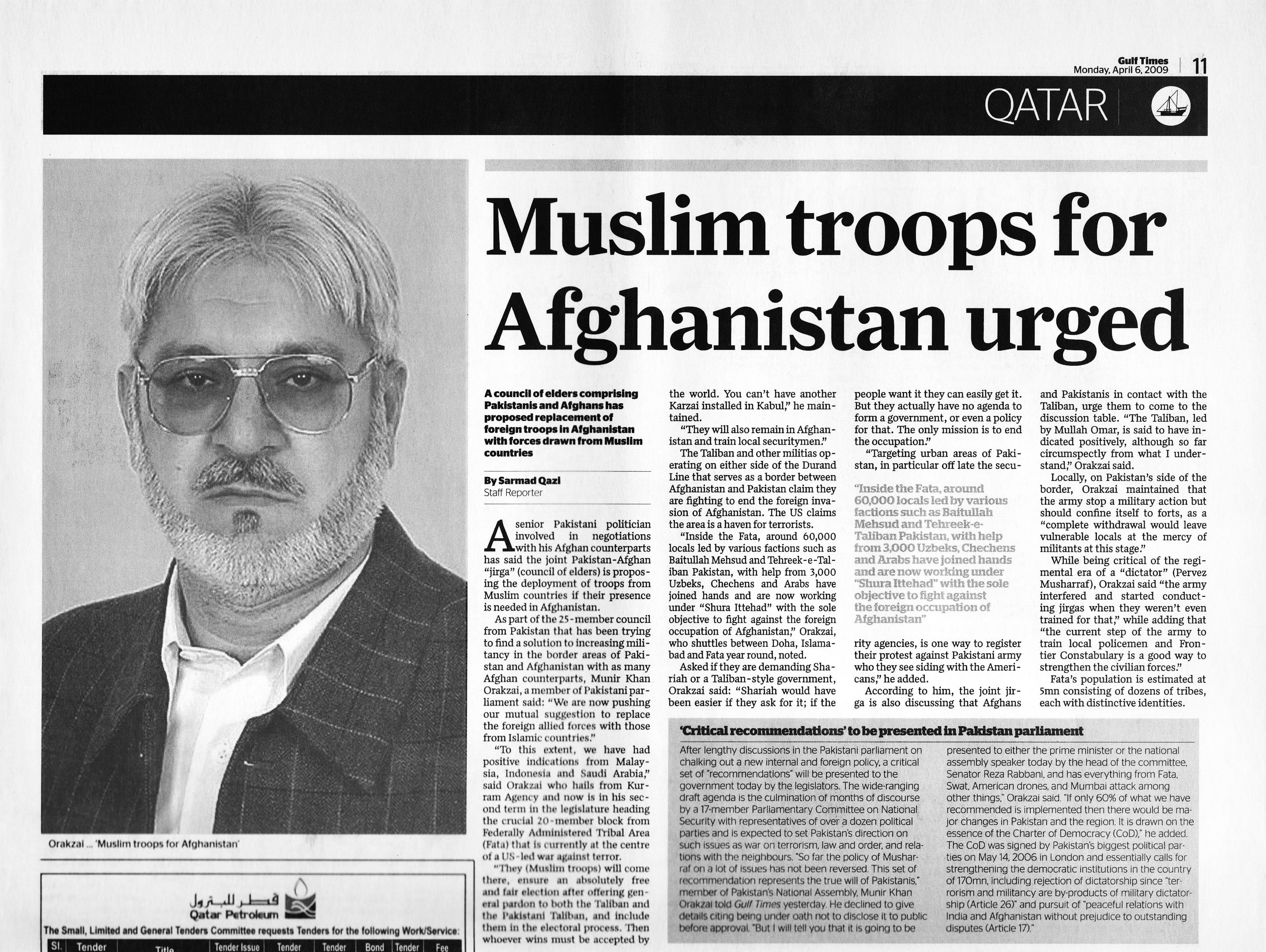 As part of the 25-member council from Pakistan that has been trying to find a solution to increasing militancy in the border areas of Pakistan and Afghanistan with as many Afghan counterparts, Munir Khan Orakzai, a member of Parliament said: “We are now pushing our mutual suggestion to replace the foreign allied forces with those from Islamic countries.”