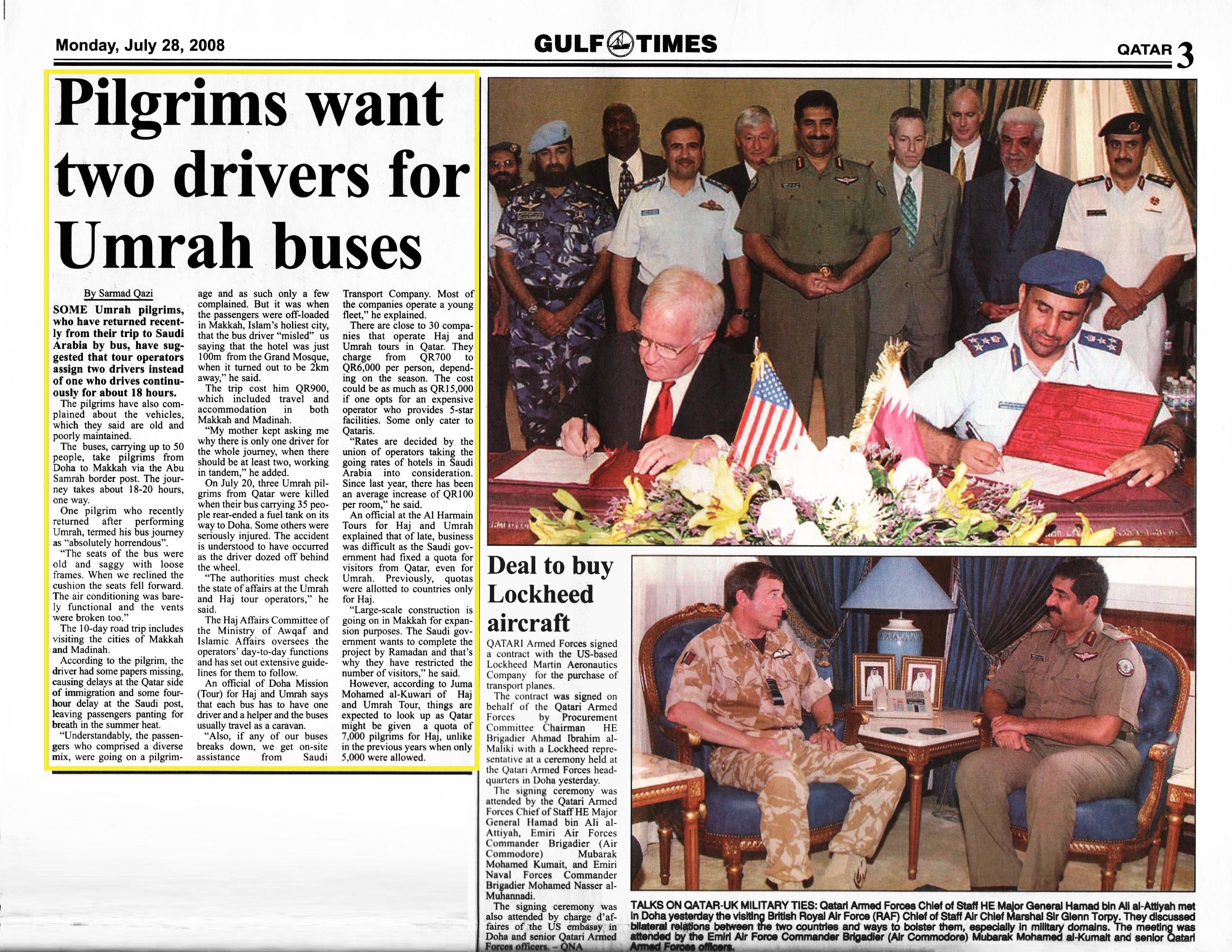 On July 20, three Umrah pilgrims from Qatar were killed when their bus carrying 35 people rear-ended a fuel tank on its way to Doha. Some others were seriously injured. The accident is understood to have occurred as the driver dozed off behind the wheel.