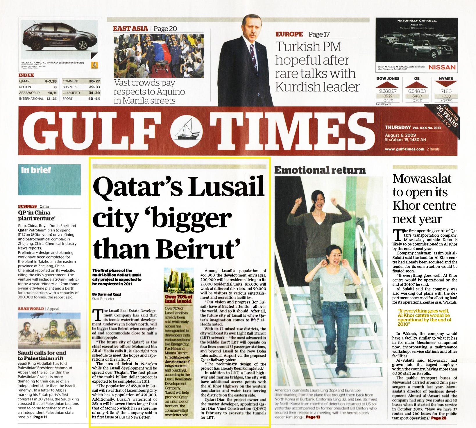 The area of Beirut is 19.8sqkm while the Lusail development will be spread over 35sqkm. The first phase of the multi-billion dollar project is expected to be completed in 2011.