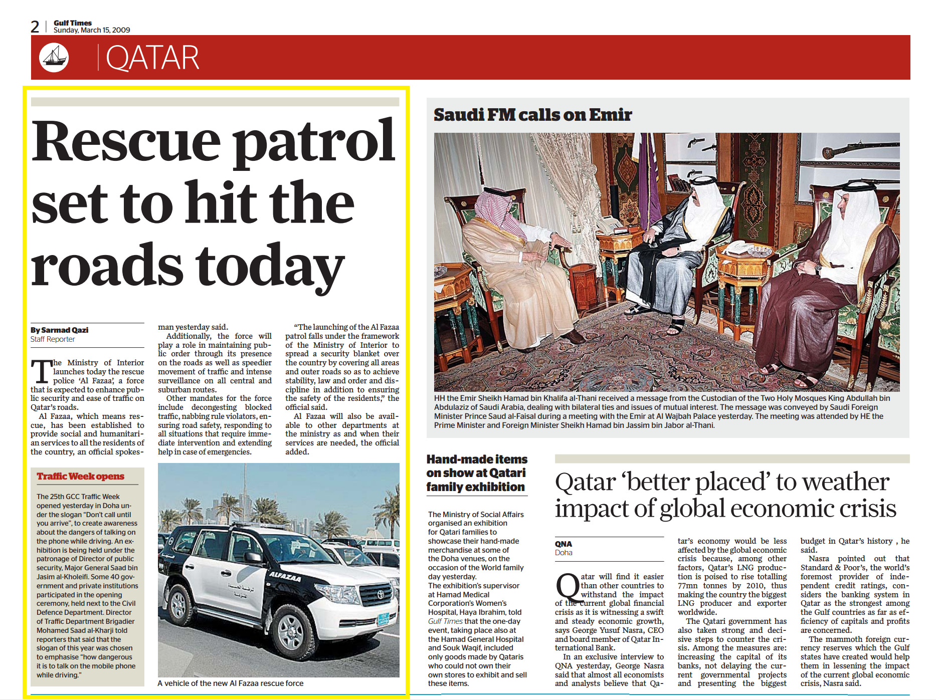 The Ministry of Interior launches today the rescue police ‘Al Fazaa’, a force that is expected to enhance public security and ease of traffic on Qatar’s roads.