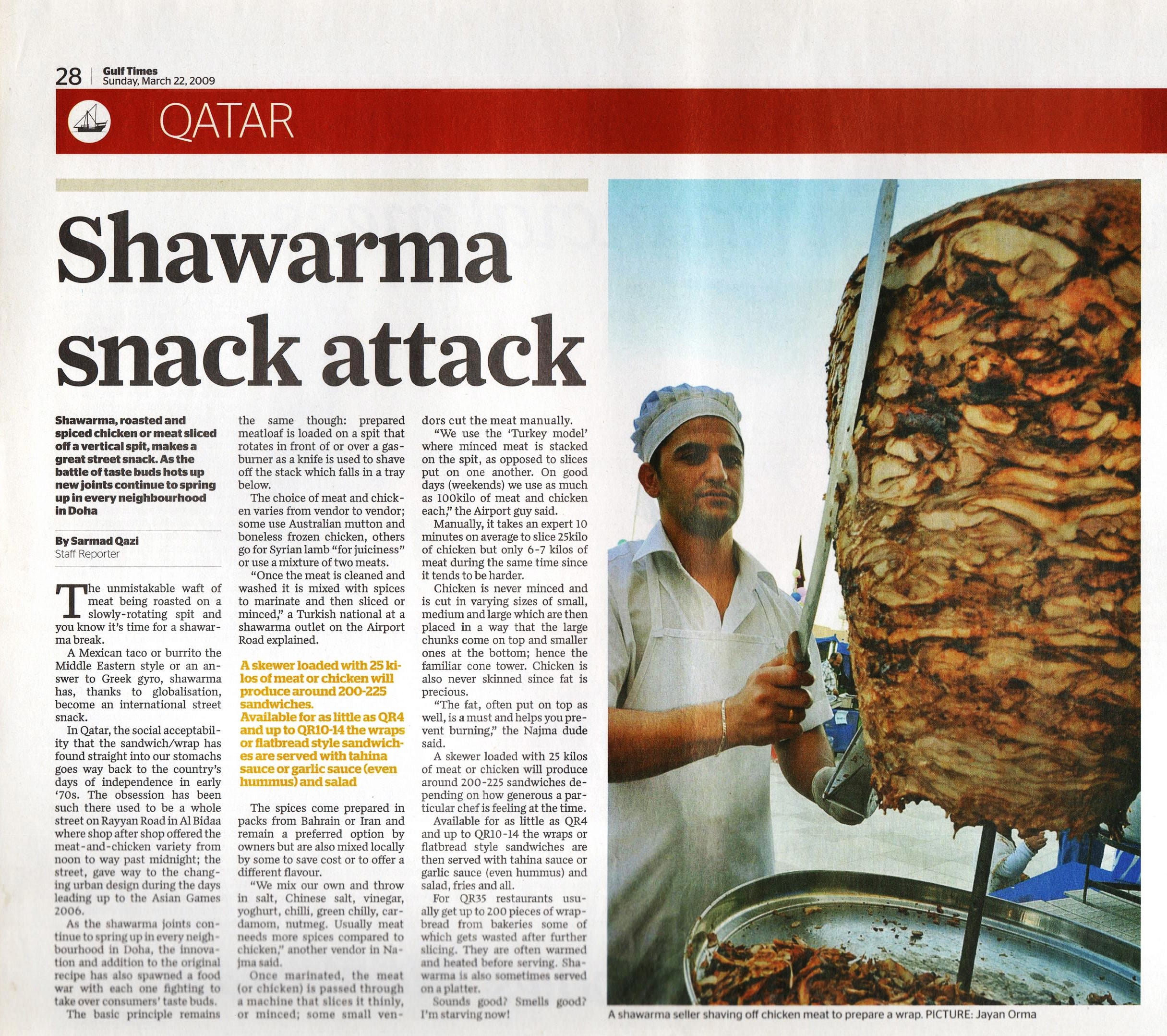 In Qatar, the social acceptability that the sandwich/wrap has found straight into our stomachs goes way back to the country’s days of independence in early ’70s. The obsession has been such there used to be a whole street on Rayyan Road in Al Bidaa where shop after shop offered the meat-and-chicken variety from noon to way past midnight; the street, gave way to the changing urban design during the days leading up to the Asian Games 2006.
