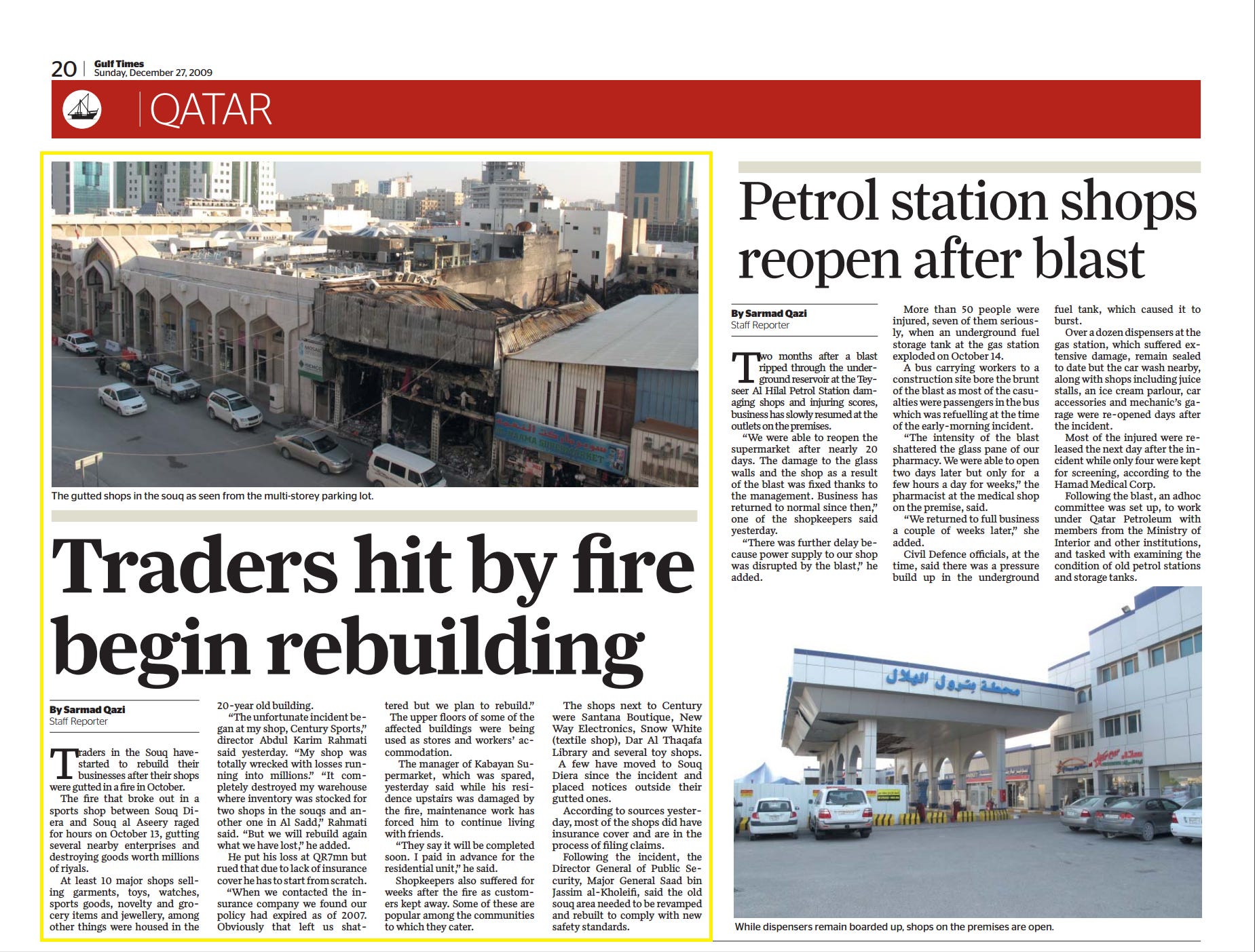According to sources yesterday, most of the shops did have insurance cover and are in the process of fi ling claims. Following the incident, the Director General of Public Security, Major General Saad bin Jassim al-Kholeifi , said the old souq area needed to be revamped and rebuilt to comply with new safety standards.